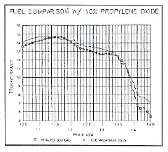 Propylene Oxide's primary contribution to the combustion process centers on it's high heat of vaporization. As we discussed in Part Four of this series (NKN June 1995), this high heat of vaporization means that, as it passes from a liquid to a gaseous state in the carburetor, it absorbs a significant amount of heat and, thus, cools the incoming fuel charge significantly, making it denser. While Propylene Oxide brings along some of the oxygen it needs for it's own combustion, it also takes additional oxygen from the carburetor air. It's specific energy is slightly less than that of gasoline, so don't expect any help there. It's combustion products are C02, CO, and water vapor. As you can see from the graph, there is no measurable performance difference between the