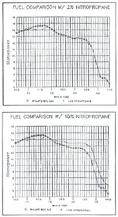 Nitromethane that appeared, even in the 10% concentration, is it's substantially higher heat output. During the relatively short duration of our dyno run, we saw cylinder head temperatures climb dramatically over what we had seen with the gasoline only sample. At the same time we saw exhaust temperatures fall, a combination indicative of detonation. It should be expected that extended running would require a richer mixture to avoid sticking. Such a richer mixture would probably diminish the performance improvements somewhat.