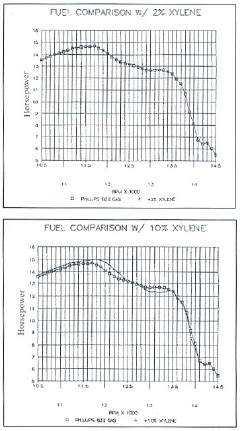 Xylene. As expected the 2% graphs show only the most minor variation, with some gain in the low RPM range. This is most likely due to the increased octane rating from adding these materials helping to suppress some high load, low RPM detonation.